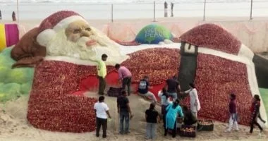 نحت فنان هندي بابا نويل باستخدام 1.5 طن من التفاح، ليصل طوله إلى نحو 18 متراً وعرضه نحو 13.7 متراً، وهو واقف أمام أحد الشواطئ كما ذكر تقرير إعلامي.