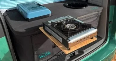 يطوى المطبخ بشكل مسطح داخل المركبة ثم ينفخ في موقع التخييم ليصبح جاهزاً للاستخدام، وهو يزن بين 8 و15 كغ بحسب التجهيزات المختارة. هذا الخيار عملي حتى لأصغر مركبات التخييم.