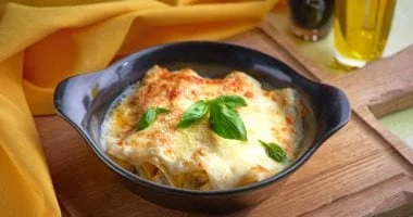 ابدأ بتجهيز المكونات: 2 صدور دجاج مقطع مكعبات صغيرة، 1 بصلة متوسطة مفرومة، 2 فص ثوم مفروم، 2 كوب حليب كامل الدسم، 2 ملاعق كبيرة دقيق، 2 ملاعق كبيرة زبدة، 1/2 كوب جبن موتزاريلا مبشور، 1/4 كوب جبن شيدر مبشور، ملح وفلفل أسود حسب الرغبة، رشة جوزة الطيب، وبقدونس مفروم للتزيين.