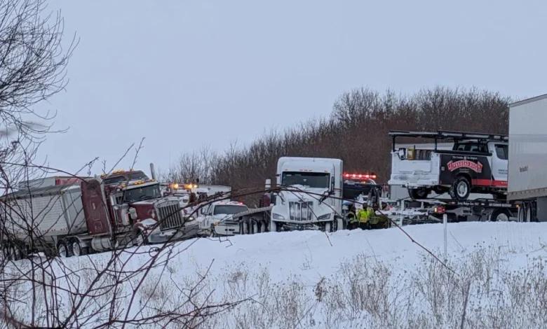وتضمن الحادث الذي وقع صباح الاثنين ما يصل إلى 40 شاحنة نقل ثقيلة، وظل الطريق المغطى بالثلوج مغلقاً.