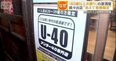 أثارت حانة إيزاكايا في شيبويا جدلاً واسعاً بعدما وضعت لافتة تمنع دخول من يتجاوز عمره 40 عاماً وتوضح أن المكان مخصص للزبائن بين 20 و39 عاماً.