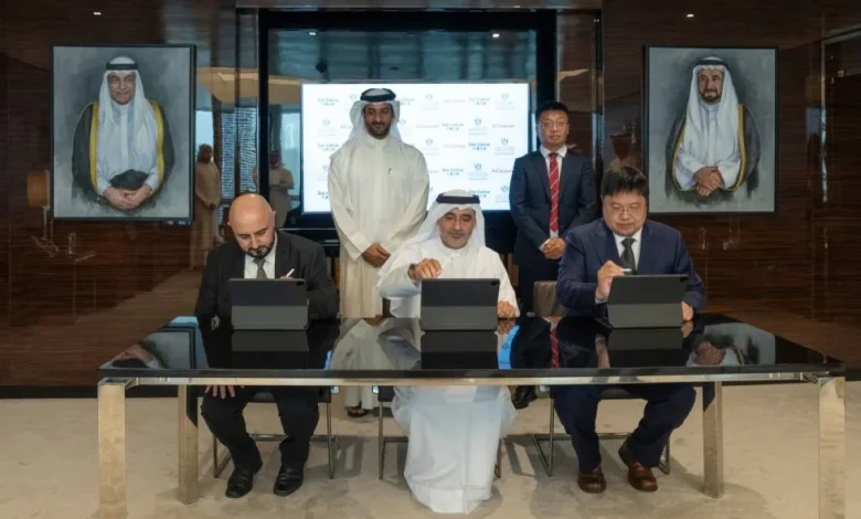 وقعها من الطرف الثلاثة راشد علي آل علي، المدير التنفيذي لهيئة الشارقة لتقنيات الاتصال، ولي فانغ، الرئيس التنفيذي لشركة داتاكانفاس إنترناشيونال، وجاف مير، مدير التخطيط الاستراتيجي والعلاقات في شركة إيه آي كارافان.