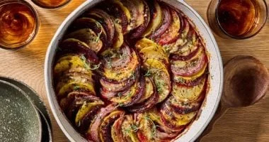يتميز بطبقات من القرع والبصل الأحمر والبطاطس والبنجر، حيث تتحد الخضراوات وتُدهن بزيت بالثوم قبل الخبز لإضفاء نكهة مالحة غنية، ما يجعل هذا الطاجن مثالياً لعشاء دافئ في ليالي الخريف.