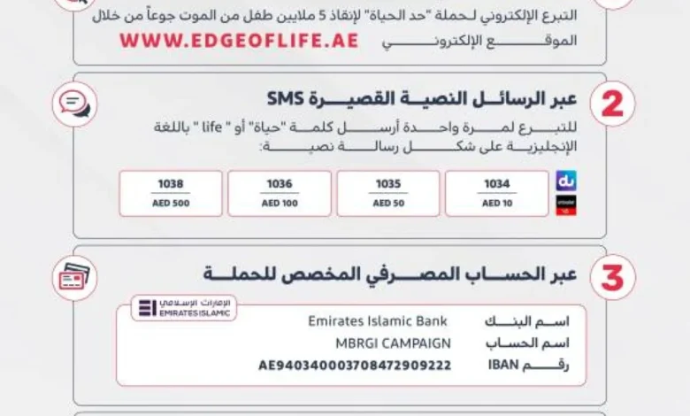ويستقبل موقع الحملة على www.edgeoflife.ae التبرعات من الأفراد والمؤسسات والشركات ورجال الأعمال داخل الدولة وخارجها، حيث يمكن تقديم المبلغ الذي يريده المتبرع لدعم الحملة والمساهمة في تحقيق أهدافها.