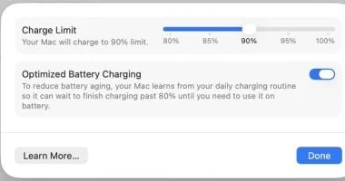 ابدأ باستخدام ميزة حد الشحن التي تتيح لك تحديد الحد الأقصى لشحن جهازك لحماية بطاريته. كانت هذه الميزة في البداية متوفرة حصريًا لأجهزة آيفون وآيباد، ثم توسعت لتشمل أجهزة ماك بوك.