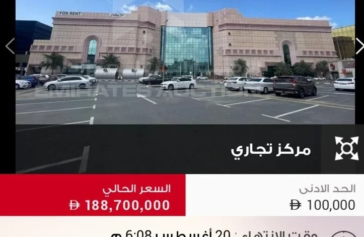 شهدت قاعة المزادات الإلكترونية لشركة «الإمارات للمزادات» منافسة محتدمة بين 37 مزايداً انتهت ببيع مركز «لامسي بلازا» الشهير في منطقة عود ميثاء بدبي، مقابل 188.7 مليون درهم، متجاوزاً السعر الافتتاحي البالغ 185 مليون درهم بفارق 3.7 ملايين درهم.