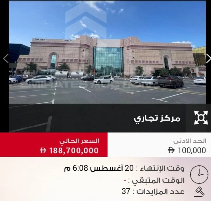 شهدت قاعة المزادات الإلكترونية لشركة «الإمارات للمزادات» منافسة محتدمة بين 37 مزايداً انتهت ببيع مركز «لامسي بلازا» الشهير في منطقة عود ميثاء بدبي، مقابل 188.7 مليون درهم، متجاوزاً السعر الافتتاحي البالغ 185 مليون درهم بفارق 3.7 ملايين درهم.