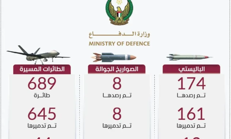 أعلنت وزارة الدفاع أن الدفاعات الجوية الإماراتية تعاملت أمس بنجاح مع 9 صواريخ باليستية و6 صواريخ جوالة و148 طائرة مسيّرة.