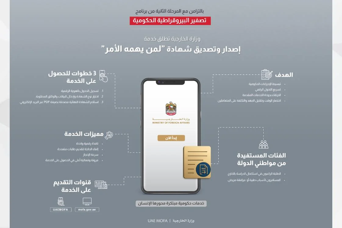 أعلنت وزارة الخارجية في دولة الإمارات عن إطلاق خدمة رقمية مبتكرة تتيح للمواطنين في الخارج إصدار وتصديق شهادة “لمن يهمه الأمر” إلكترونياً، في خطوة تعكس تسريع مسيرة التحول الرقمي وتبسيط الإجراءات الحكومية ضمن برنامج “تصفير البيروقراطية الحكومية”.