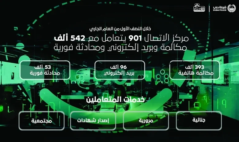 شهد مركز الاتصال «901» التابع لشرطة دبي نشاطاً مكثفاً خلال النصف الأول من العام الجاري، حيث تمكن من معالجة أكثر من 542 ألف تواصل متنوع بين مكالمات هاتفية ورسائل بريد إلكتروني ومحادثات عبر التطبيقات الذكية، ما يعكس دوره المتنامي في تعزيز الأمن والخدمات المجتمعية وتلبية احتياجات المتعاملين غير الطارئة.