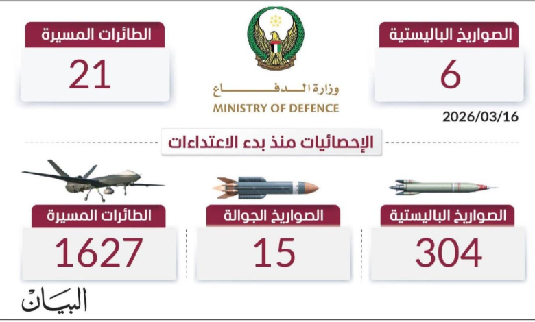 ومنذ بدء الاعتداءات الإيرانية السافرة، تعاملت الدفاعات الجوية الإماراتية مع 304 صواريخ باليستية، و15 صاروخاً جوالاً، و1627 طائرة مسيّرة.