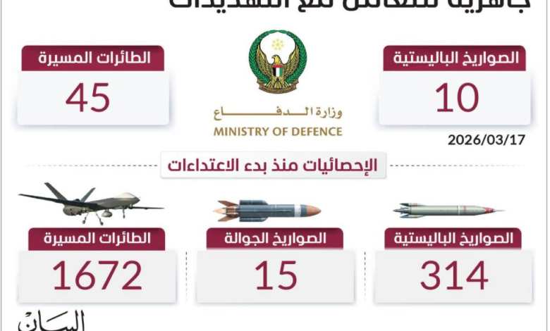 ومنذ بدء الاعتداءات الإيرانية السافرة تعاملت الدفاعات الجوية الإماراتية مع 314 صاروخاً باليستياً و15 صاروخاً جوالاً و1672 طائرة مسيرة.